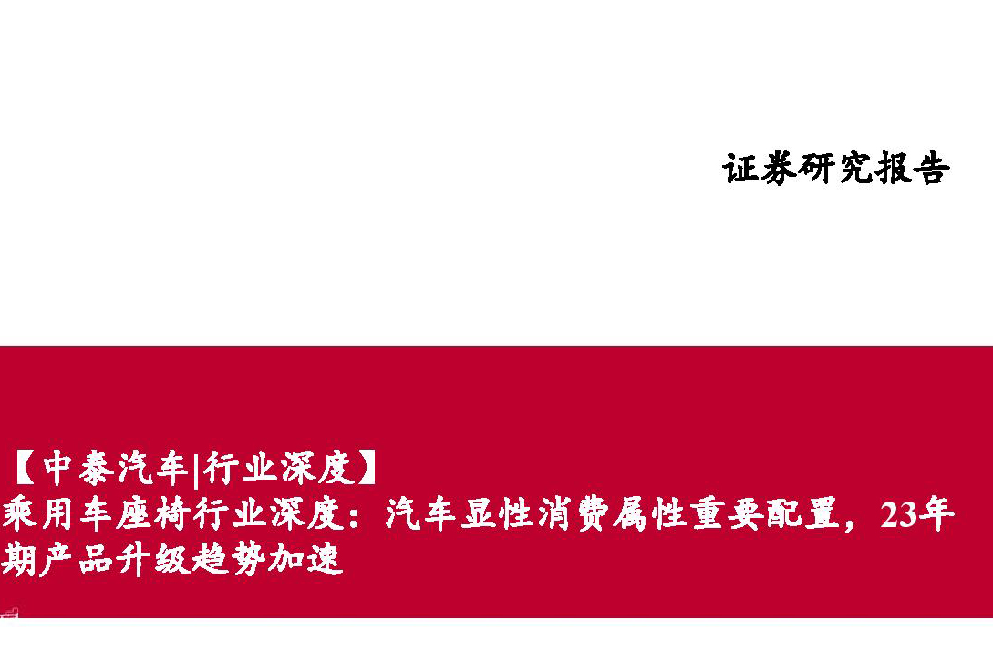 乘用车座椅:消费属性配置最重要卖点,高端配置加速下沉,升级趋势全面提速。 中观维度:电动化差异弱、智能化差异当前阶段暂不明显,消费属性配置成为车企打造差异性的重要发力点。 微观维度:座舱是消费属性配置落脚点,座椅是智能座舱最重要消费属性的硬件。 座椅升级趋势:依托零部件增量和升级实现舒适性和个性化的...