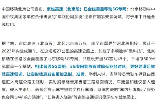 4 月 25 日消息,中国移动北京公司于近日宣布,京雄高速北京段已全线覆盖移动 5G 专网。 图片来源:北京新闻广播截图 据介...