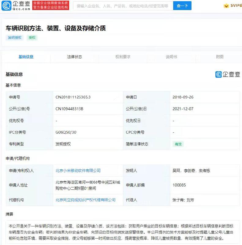 从企查查APP显示,12月7日,北京小米移动软件有限公司“车辆识别方法、装置、设备及存储介质”专利获授权。 该专利摘要显示,本...
