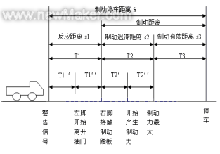1 .汽车制动停车过程的分析 交通事故具有突发性,令驾驶员措手不及。下面我们分析一下制动停车的全过程。如图分析: T1=T...