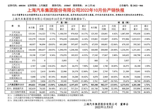 上汽10月:海外累销超去年,国内产销双下滑