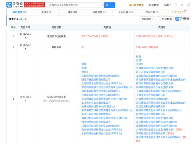 近日,企查查显示,上海同驭汽车科技有限公司发生工商变更,新增小米集团关联公司海南极目创业投资有限公司为股东,同时公司注册...