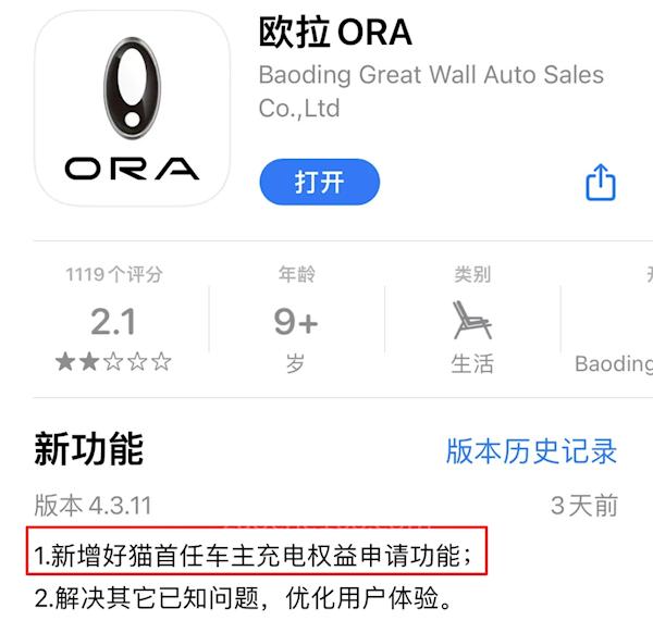 近日,“欧拉ORA”APP发布新版本升级,升级说明中明确说明,新增好猫首任车主充电权益申请功能。 好猫的车主在升级了手机APP以...