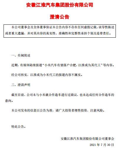 江淮汽车发布公告称未与小米就合作造车进行过商议