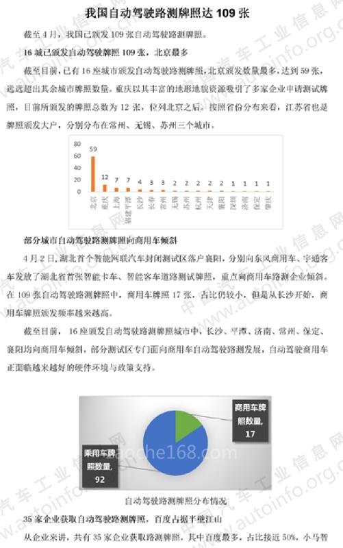 据中国汽车工业信息网消息,截至4月,我国已颁发109张自动驾驶路测牌照。北京颁发数量最多,达到59张。 据统计,颁布自动驾驶路...