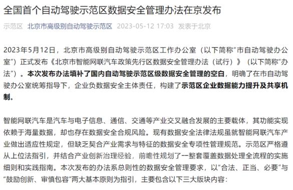 填补空白,全国首个自动驾驶示范区数据安全管理办法在京发布