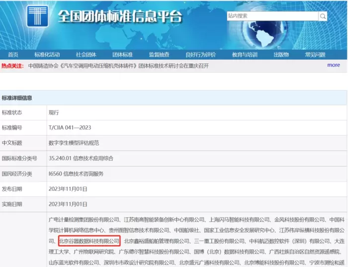 近日,谷器数据参编的团体标准《数字孪生模型评估规范》(TCIIA 041—2023)于2023年11月1日正式发布并施行。 《数字孪生模型...