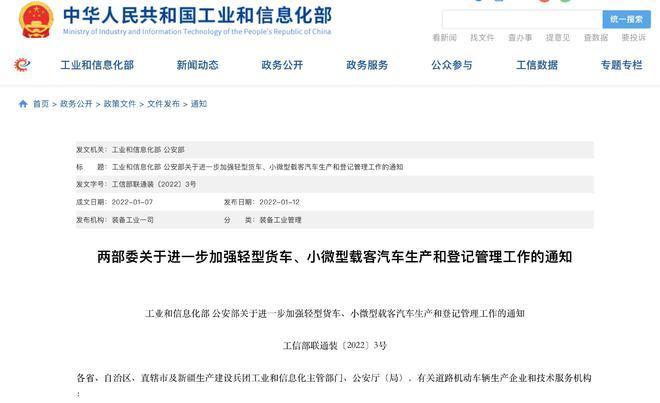 日前,工业和信息化部、公安部联合发布了《关于进一步加强轻型货车小微型载客汽车生产和登记管理的通知》(以下简称《通知》)。...