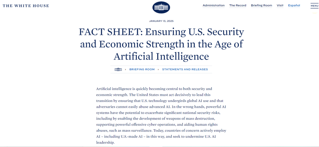 当地时间1月13日,美国政府通过白宫官网正式公布了针对人工智能(AI)的临时最终出口管制规则,以国家安全为由,将进一步限制人工...