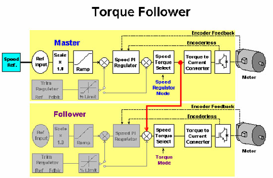 即从变频器跟随主变频器的转矩给定运行。由于在主从控制模式中每个电机都有独立的拖动系统, 主机或从机的独立运行可以用于冗余运行。即可以通过数字输入口完成速度控制和转矩控制之间的自由切换, 使之成为完善的独立拖动系统。
