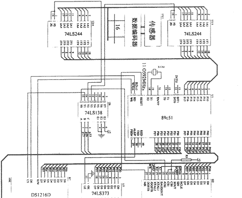 (2)SRAM的选择与连接,静态RAM保存加有时标的数据,选择DALLAS公司生产的DS1216D,内带有电池和实时日历时钟功能,内含RAM为628128,容量为128K,该芯片掉电自动保存数据和时钟运行。