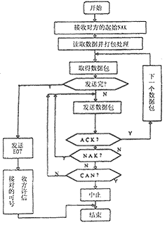 当某一方单片机接收到呼叫振铃后,RI信号有效,8250的INTRPT引脚高电平中断,系统便进入数据通信状态,为了使数据传送准确无误,编程采用XMODEM协议对数据打包处理,单片机数据通信程序流程图如图4。