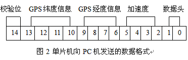 单片机向PC发送的数据包由15个字节组成。数据包开头的两个字节,我们设定第0和第1字节分别为0xEB和0x90,定义为数据头。当有数据向PC机发送的时候,检测数据头是否与设定值一致,一致就继续接收剩余的数据,否则舍弃该数据包。第2~5字节留给加速度传感器信息。第6~9字节为采集的GPS纬度数据;第10~13字节表示采集来的GPS精度数据;第14个字节为校验字节,该字节等于前14个字节的和,用来检验接收的数据包是否完整。图3所示为PC机向单片机发送的数据包格式。
