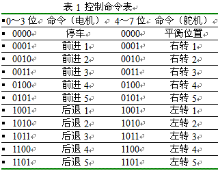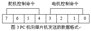 PC机向单片机发送的命令占用一个字节,低四位表示对电机控制的命令和数据,高四位表示对舵机提供的命令和数据。第3位表示电机进退位,“0”表示前进,“1”表示后退,第0~2位表示控制量;同理,第7位表示舵机转向控制位,“0”表示右转,“1”表示左转,第4~6位表示控制量。控制命令如表1所示。