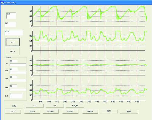 下位机向上位机传输的是以每20ms传输一组包含了光电编码器值(speed),电池电压(battery),舵机转角值(angle),传感器当前状态 (sensor)的数据,如果是在理想状态下,上位机接收到的应是上述各值循环出现的周期性数据,此时上位机只需将这些数据按顺序装入各自的数组并画图即可。但在实际的无线传输过程中可能出现数据丢失现象。因此加入适当的数据校验是必要的,否则会出现数据装入错误,造成画图的混乱。我们在实际过程中是在每组数据中加入0x00,0xff的帧头,当数据出现错误时,则舍弃该帧数据。
