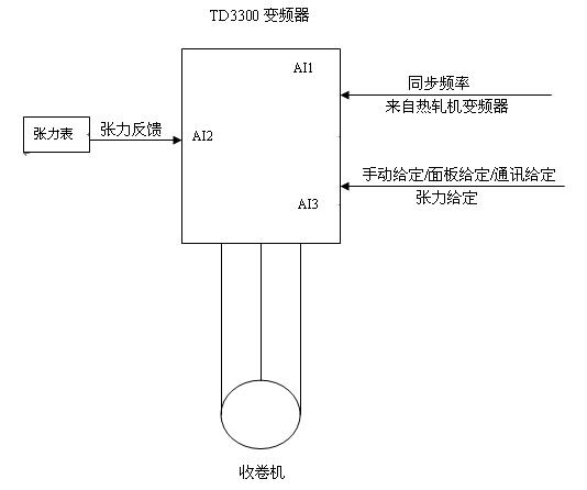 假定收卷机实际运行的频率设为F,实际的运行中F=F1+ FPID,F1:为同步频率,在此方案中来源于热轧机变频器的模拟量输出,经过机械传动比,前后压辊,卷筒等参数计算后作为同步频率;FPID是变频器经过PID运算后得到的计算频率。而在TD3300变频器进行PID运算时必须得保证有两个条件,即张力反馈和张力给定。把热轧机变频器输出接过来的同步频率接在TD3300模拟量端口AI1,把从张力表接过来的模拟量接在TD3300模拟量端口AI2作为张力反馈。而张力给定有不同的方式:可以由面板F8.02直接给定,可以用Profibus数字量通讯给定,还可以用模拟电位器AI3手动给定。在不同的工艺要求下,设置不同的张力给定值。而系统的实际张力值通过张力传感器后可以直接显示在张力表上,供工艺人员监测。其具体连接如图(三)所示。