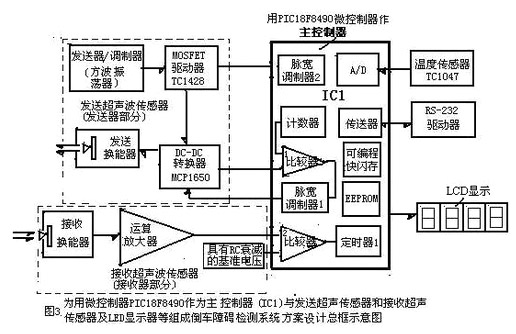 图3为汽车倒车障碍检测系统设计方案框图, 设计方案包括:IC1主控器-为用Microchip的 PIC l8F8490微控制器作为汽车倒车障碍检测系统的主控器;发送部份(即发送超声波传感器)与接收部份(即接收超声波传感器);温度传感器(TC1047A)、通信接口RS-232驱动器以及与LCD或LED显示器等外围电路组成。