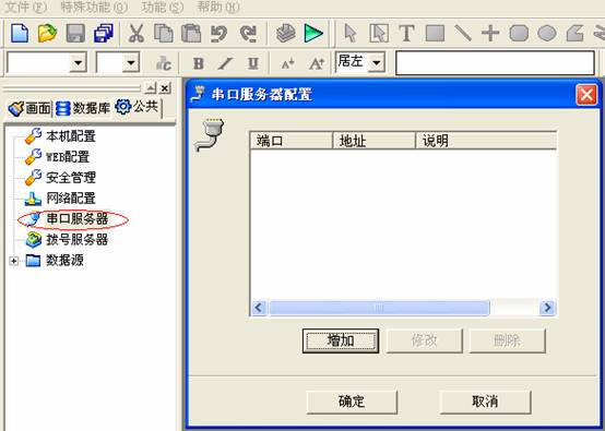 进入开发环境,在导航树中选择“公共/串口服务器”并单击,出现串口服务器配置框: