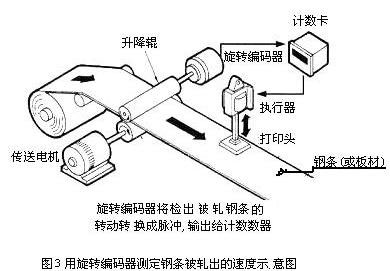 位移传感器确定了液压气缸的位置并向控制器提供与金属计量仪(或两轧辊之间间距)相关联的数字输入信号。旋转编码器(TRD-K)固定在转动的升降辊上,它显示钢条被轧出的速度,其示意见图3所示。通过利用各种传感器接收数据,运行于PXI控制器的LabVlEW RT对输入做出响应并生成改变液压压力的输出信号,从而控制钢条的规格。无论是厚度计量仪与位移传感器均可采用光纤传感器来实施。