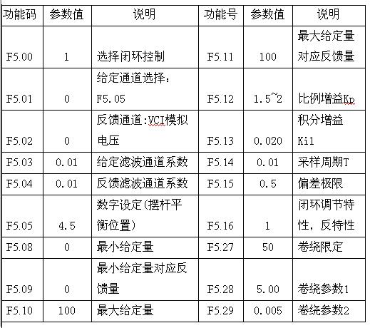 依上图将张力摆杆电位器接入EV-1000的相应接线端子,调整变频器参数中的相关参数如下: