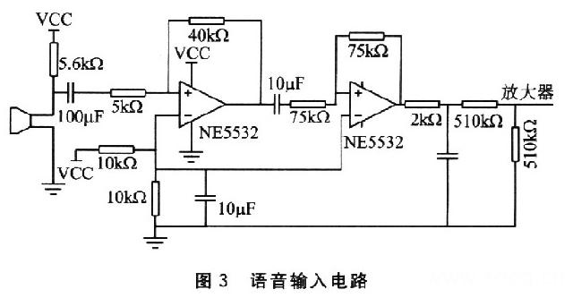 报站器不需要录音功能,因此MIC电路无须接入MP3电路中。MIC电路的音频信号作为汽车功放的另一路输入接入,如图3所示。