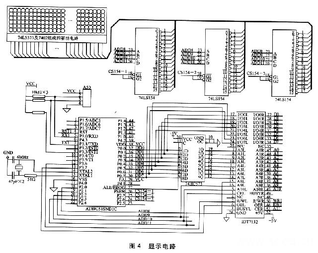 如图4所示,显示电路由IDT7132、AT89C5l、74LSl54、74HC573以及1个16×256的LED点阵屏构成。IDT7132是一片容量为32 KB的双口RAM,由于16×256的LED点阵屏显示缓存共需512字节的存储空间,电路使用它与AT89C5lSNDlC接口并存储汉字显示信息。16×256的LED点阵屏可显示16个16×16的点阵汉字,显示屏分32页,每页又分成16行。本设计采用两片4-16译码器74LS154组合成一个5-32译码器,作为页译码器;采用一片74LSl54作为行译码器。每一页对应一个74HC573,用于锁存该页某一行显示的内容;32个74HC573可锁存16×256的LED点阵屏一行的内容,显示屏由7407驱动。AT89C5l从双口RAM规定区域取出显示内容,控制页译码器把数据分别送入每一页的当前行中,然后控制行译码器换行,如此循环形成动态显示。显示电路作为~独立模块使用,报站器显示信息时,只需把欲显示的汉字字模送入双口RAM对应的存储区域。