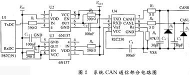 为使系统达到反应灵敏、可靠性高的设计要求,前后节点的控制单元均采用Philips公司生产的P87C591单片机,他成功包括了Philips半导体SJAl000 CAN控制器的PeliCAN功能,符合系统设计要求。主控系统CAN通信部分电路图如图2所示[1>: