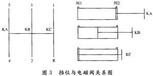 如图3所示,当阀1通气、阀2断气时,活塞被推到气缸右端,通过活塞杆把拨叉推到预定位置,将此位置定义为KA层;当阀1断气、阀2通气时,定义为KC层;当两个阀都断气,由于变速箱内回位弹簧的作用,将会自动定位到中间层,定义为KB层。层位选定后,再通过相应位置上两个上档气阀的作用以实现不同方向的上下档动作,从而完成预定的选档和换档动作。