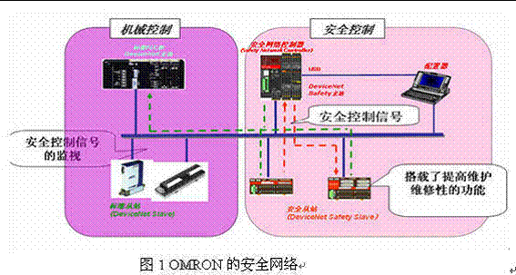 传统安全系统仍停留在“安全继电器”或“安全PLC”的非总线控制系统的低级控制状态,大大限制了生产过程控制系统的发展。但如果将这些安全设备连接到非安全的现场总线系统上去,就会存在比较大的安全隐患,是一种非安全的控制状态。基于这种状况,OMRON开发了一种安全网络系统DeviceNet Safety,如图1所示,该总线控制系统大大加快了控制系统前进的步伐。使用该DeviceNet安全控制网络具有以下优点明显:可以取得认证软件逻辑安全回路;互锁继电器盘的小型化,节省空间;按照用户要求可以灵活处理程序变更;可以灵活处理设备的模型变更;节省布线;缩短开发时间等。 2. 安全总线系统在汽车行业的应用
