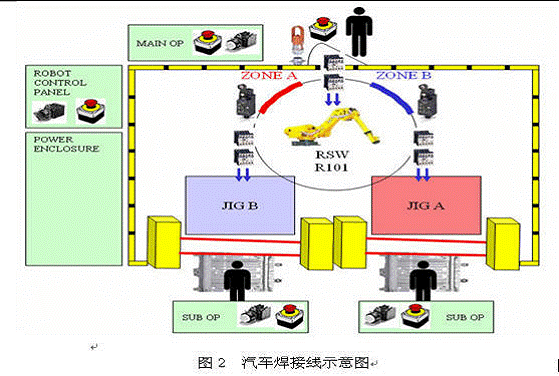 下面以汽车焊接生产线为例,介绍OMRON安全产品在其中的应用。 图2为汽车生产中的车体焊接生产线示意图,包括主控制面板,焊接工作台JIG A和JIG B,工人操作台等部分。其中,POWER ENCLOSURE为主控制柜,ROBOT CONTROL PANEL为焊接机器人控制面板,MAIN OP 面板控制主设备的启动、停止,SUB OP为局部操作面板。工作过程为:焊接机器手轮循对进入工作台A,B中的车体进行焊接,当A焊接完成后,该车体自动退出焊接工作台A,等待下一个进入焊接,同时,机器手转向工作台B,对进入该工作台的车体进行焊接,焊接完成后的车体退出工作台B,等待下一个进入,同时机器手返回A中对已就位的车体焊接…., 如此周而复始。