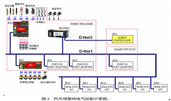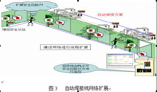 在这种自动化程度较高的焊装车间中,大量的焊接机器人和装配机械手的出现,造成了许多需要安全保护的危险区域。因此,安全产品的应用显得非常重要。在图2中,急停开关可在设备出现异常情况下立即停止其运行;焊接工作台与工人操作台之间安装安全光幕,以防机器手工作期间身体的进入;在机器手工作半径附近的区域安装激光区域扫描器,防止人体进入危险区域;同时,可通过DeviceNet安全网络进行远程扩展,如图3所示。