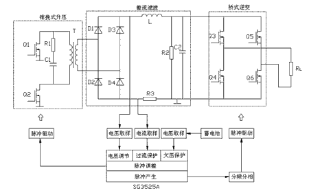 我们采用集成脉宽调制芯片SG3525A为主控芯片,以CD4020B计数器及与非门电路构成分频分相电路并配以保护电路,实现了逆变器的脉宽调制。其在逆变电源工作时的持续输出功率为100W,并具有输出过流保护及输入欠压保护等功能,可实现电源逆变、电压稳定、欠压保护及过流保护等功能。