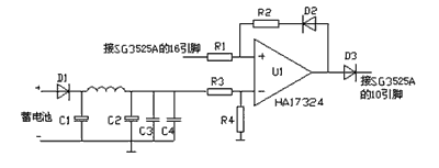 如图5所示,D1为蓄电池极性反接保护。SG3525A的引脚16输出参考电压5V,取R3=R4=10kΩ。在正常情况下,U1的反相输入端电压大于正向输入端电压,U1输出低电平,二极管D1、D2截止。当蓄电池电压低于10V时,比较器U1开始工作,输出由低电平变为高电平,D2、D3导通,并把同相输入端电位提升为高电平,使得U1一直稳定输出高电平,向SG3525A的引脚10输出关断信号。