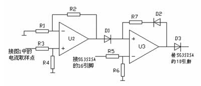 如图6所示,运放U2及外围电阻构成反比例放大器,运放U3及外围电路构成比较器。图1中的R3为取样电阻,取2.2Ω,2W。当负载电流增大时,该电阻的压降△U增大。