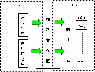 ERP和MES物料管理范围划分一般为:从综合仓库,供应商仓库到总装暂存区的物料请求、发送和接收由ERP系统管理,从物料暂存区到车间线边库的物料拉动由MES系统管理。MES系统定时发送线边物料消耗到ERP,以便进行财务结算。
