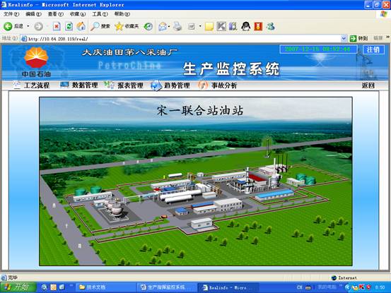 大庆油田采油八厂生产数据采集平台从功能上可分为三级:队级(包括计量间、中转站、联合站)的生产数据采集、存储、传输、显示;矿级生产数据汇总、统计、显示;厂级生产数据汇总、统计、显示。生产信息以网页形式发布,管理者通过IE进行远程浏览。