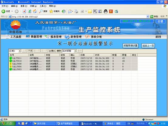 过程报警:对采集来的数据进行报警检查,生成报警记录、并将报警传送到客户端提示给用户。