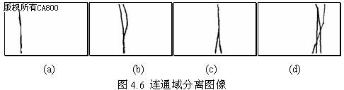 基于二值图像的形状分析,对各连通域进行标识,提取出各连通域的特征属性,如区域面积、长度、圆形度,平均宽度等,以辨别该连通域是否为长丝二值像。针对被标识的长丝连通域,按标识将各连通域分离成各各子图像。以图4.5为例将其按连通域分离为如图4.6的四个子图像。