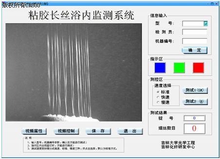 主要对粘胶长丝图像进行处理并分析出细丝根数。测试1为按序计算按钮;测试2为重新测试按钮;另外,还列出三种测试速度,以便按实际需要进行选择。