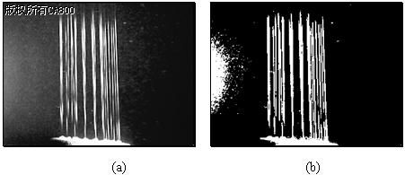 因为粘胶长丝的浴内检测图像一般背景和目标的对比度较差,经图像增强处理后,图像质量有所改善,但细丝目标与背景照明较亮的部分都的到了增强,以图4.1(a)为例,如果直接采用常用阈值分割法,会带来大量噪声白点,如图4.1(b)。