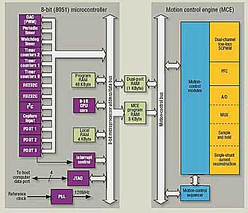 转子角度估算器和电流控制环路大约要消耗1,400个系统时钟周期,相当于128MHz最大系统时钟频率下的11μs时间。这样,在相当于20kHz开关频率的50μs PWM周期下,可以同时实现对两个电机的控制。当然,为控制两个电机,芯片需要两套空间矢量PWM调制器和用于电流采样的额外模拟输入端。图2是一个双电机控制IC的结构图,它包含嵌入式运动控制引擎和用于执行应用层代码的8位微控制器内核。这种方法的优势是它能将在微控制器上执行的慢速系统级功能与MCE执行的高速电机控制算法分隔开来。