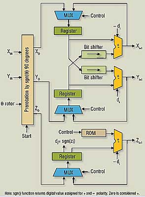 针对基于一系列加法、减法和移位函数,仅在13个周期内就可实现12位精度的ASIC实现,开发被称为CORDIC算法的矢量旋转函数(图4)。这种运算要比在32位RISC处理器上使用泰勒展开式进行运算快10倍。