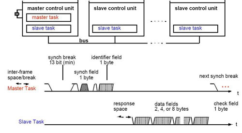 LIN总线为主从节点构架,即一个主节点(Master Node)最多可支持16个从节点(Slave Node);在从节点中不用晶振(Crystal Oscillator)或陶瓷谐振器(Ceramic Resonator)时钟,也能做到自同步性。LIN基于UART / SCI接口协议,可实现极低的软硬件成本;其信号传播时间可预先计算,以满足传输的确定性。总线电缆的长度最多可以扩展到40米左右,数据传输率可达 20 kbps。