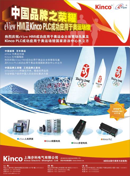 近日,步科电气自主生产和研发的eView HMI及Kinco PLC成功应用于2008年第29届北京奥林匹克运动会奥运场馆工程,其中eView HMI成功应用于奥运会主体育场“鸟巢”工程;Kinco PLC成功应用于奥运场馆国家游泳中心“水立方”工程。步科电气的产品能够服务于2008年北京奥运场馆项目,这是一个企业用心经营多年的结果。这不仅是一个企业的荣誉,它是整个中国工控界的荣誉,是中国品牌的荣誉,我们终于走出了“中国制造”,正以先声夺人的姿态向世界展示“中国品牌”的力量。