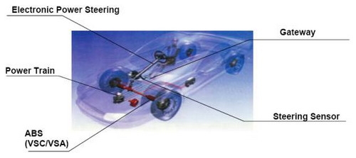 正如图3所示,FlexRay 面向的是众多的车内线控操作(X-by-Wire)。图中还展示了一个把FlexRay 和CAN网络结合的网关。
