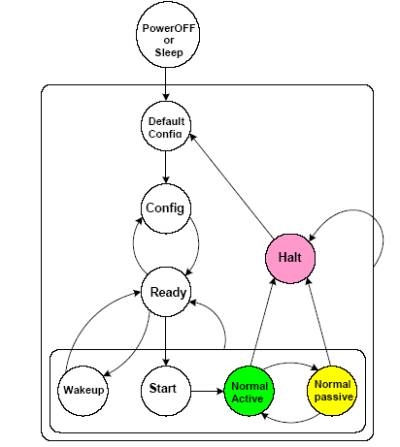 如图5所示,FlexRay的节点有几个基本的运行状态: