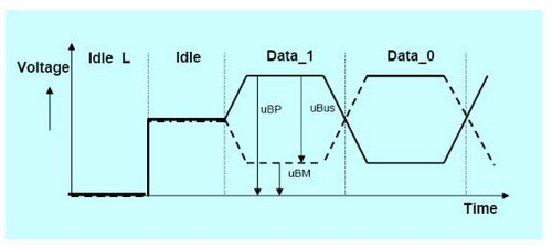 在物理层,FlexRay根据uBP和uBM的不同电压,使用不同的信号BP和BM进行通信。四个信号(见图9)代表了FlexRay总线的各种状态: