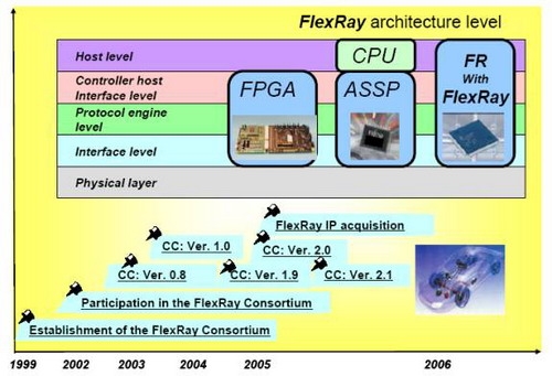 FlexRay是戴姆勒克莱斯勒公司的注册商标。FlexRay联盟 (FlexRay Consortium)推进了FlexRay的标准化,使之成为了新一代汽车内部网络通讯协议。富士通集团是FlexRay联盟的准成员,同时还是AUTOSAR(汽车开放系统架构组织)、JasPar(日本汽车软件平台和架构)的正式成员。