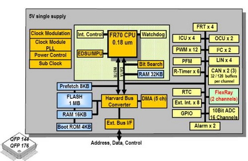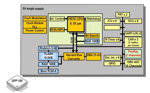 2006年,富士通将推出两款具有集成FlexRay的FR系列32位微控制器。图13展示了首款该类MCU的一些特点 。图14展示了第二款带有更多板上外围功能的