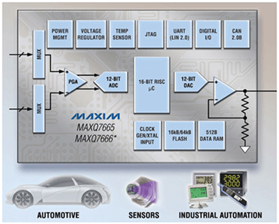 MAXQ7665/MAXQ7666内嵌16位RISC MAXQ微控制器内核,该内核具有16 x 16硬件乘法器和48位累加器以增强性能。器件能够以每MHz高达1MIPS的速率处理数字数据和执行用户指令,每MIPS仅消耗0.25mA电流。器件集成有512字节的数据SRAM,以及64kB (MAXQ7665)和16kB (MAXQ7666)的汽车级的闪存。片内带有缓冲输出的12位电压DAC、一路UART端口(用于LIN 2.0通信)、8个通用I/O或一个CAN 2.0B兼容的端口等可提供模拟和数字输出。